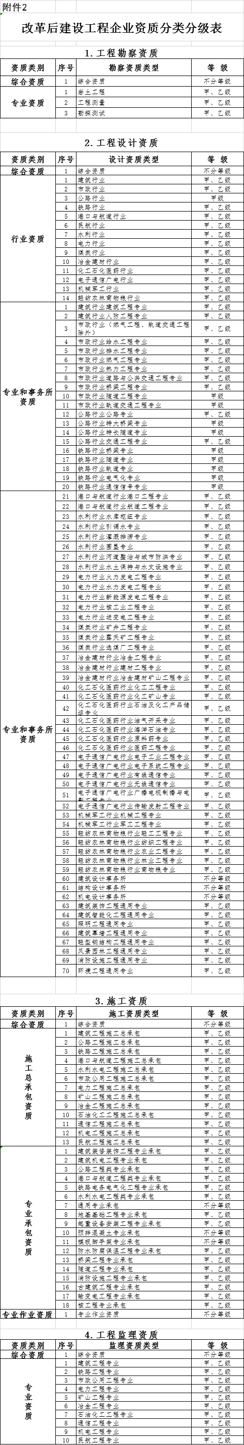 2.工程设计资质。保留综合资质;将21类行业资质整合为14类行业资质;将151类专业资质、8类专项资质、3类事务所资质整合为70类专业和事务所资质。综合资质、事务所资质不分等级;行业资质、专业资质等级原则上压减为甲、乙两级(部分资质只设甲级)。